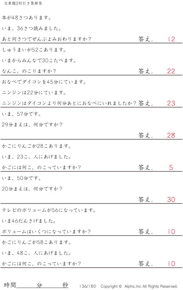 上記のボタンから「2桁の引き算の文章題」の算数数学ドリル・計算ドリル(PDFプリント)がダウンロードできます。個人利用は無料です(家庭以外での配布は有料です)。