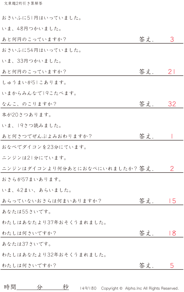 上記のボタンから「2桁の引き算の文章題」の算数数学ドリル・計算ドリル(PDFプリント)がダウンロードできます。個人利用は無料です(家庭以外での配布は有料です)。
