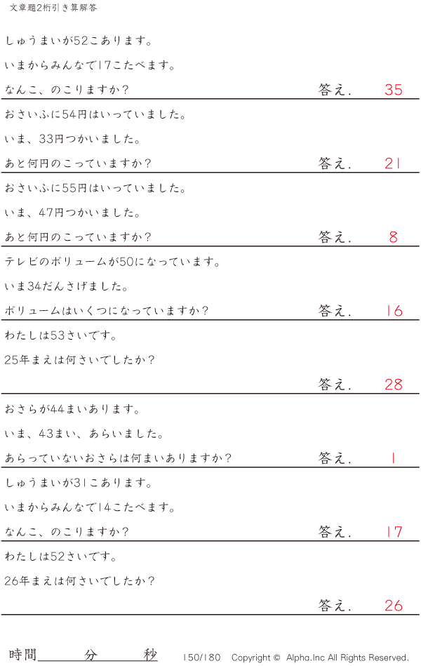上記のボタンから「2桁の引き算の文章題」の算数数学ドリル・計算ドリル(PDFプリント)がダウンロードできます。個人利用は無料です(家庭以外での配布は有料です)。