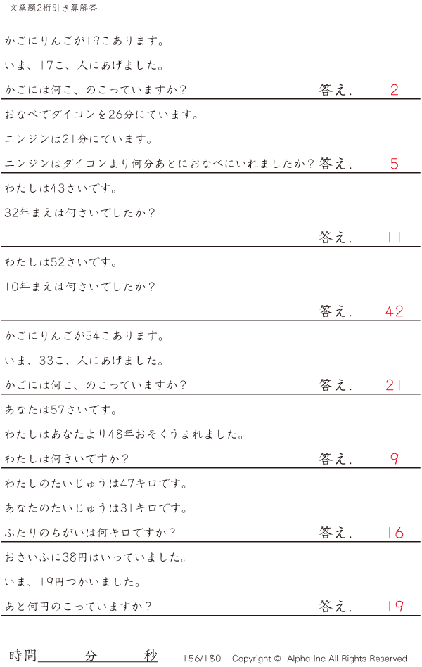 上記のボタンから「2桁の引き算の文章題」の算数数学ドリル・計算ドリル(PDFプリント)がダウンロードできます。個人利用は無料です(家庭以外での配布は有料です)。