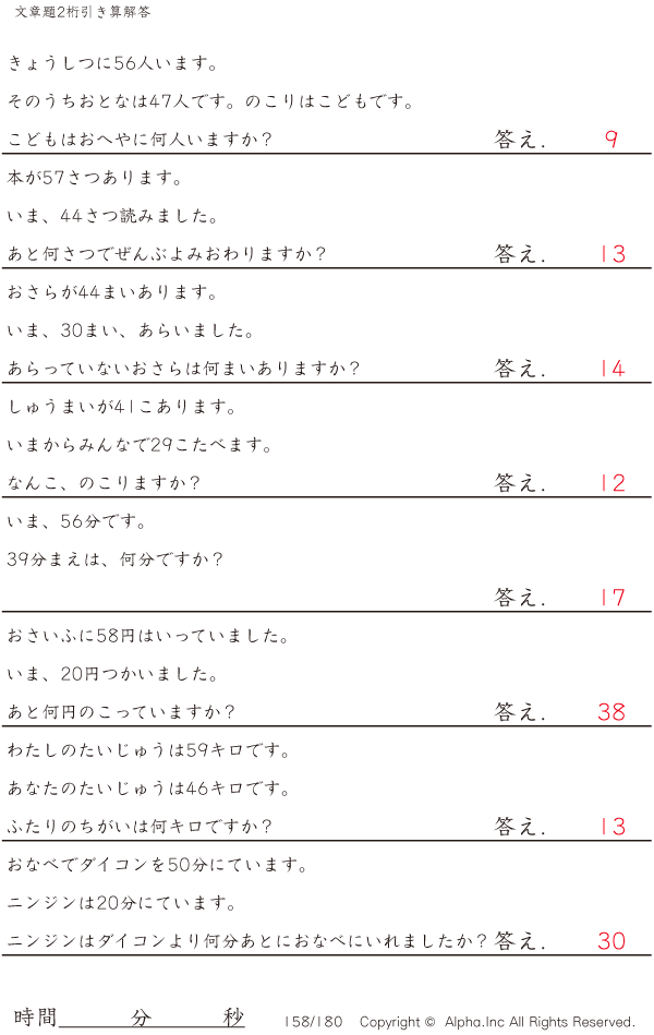 上記のボタンから「2桁の引き算の文章題」の算数数学ドリル・計算ドリル(PDFプリント)がダウンロードできます。個人利用は無料です(家庭以外での配布は有料です)。
