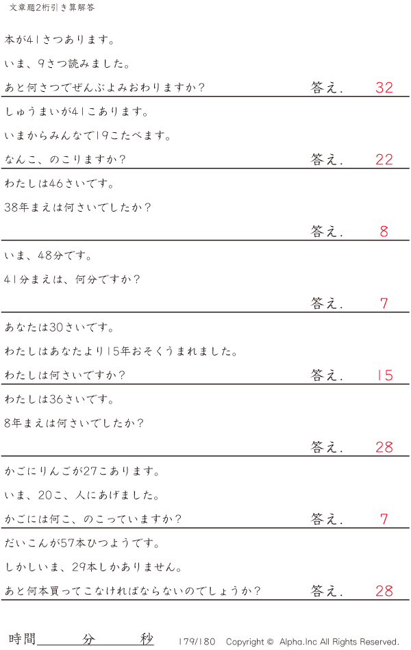 2桁の引き算の文章題 [解答]179/180