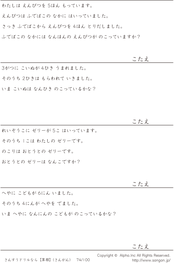 1桁の引き算の文章題(ひらがな) [問題]074/100