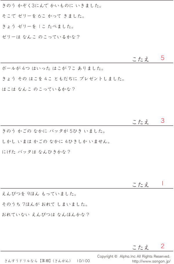 1桁の引き算の文章題(ひらがな) [解答]010/100