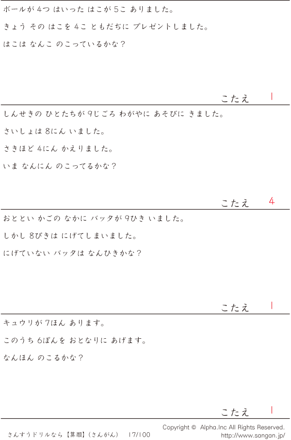 1桁の引き算の文章題(ひらがな) [解答]017/100