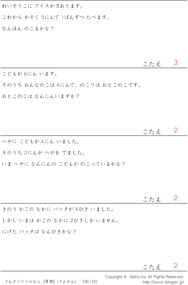1桁の引き算の文章題(ひらがな) [解答]058/100