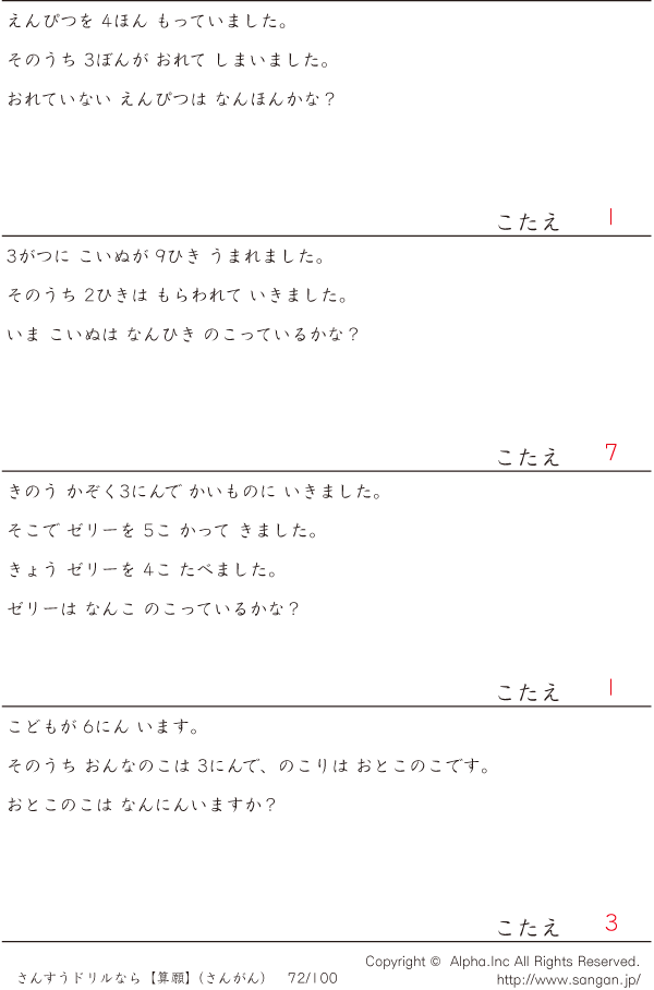 1桁の引き算の文章題(ひらがな) [解答]072/100