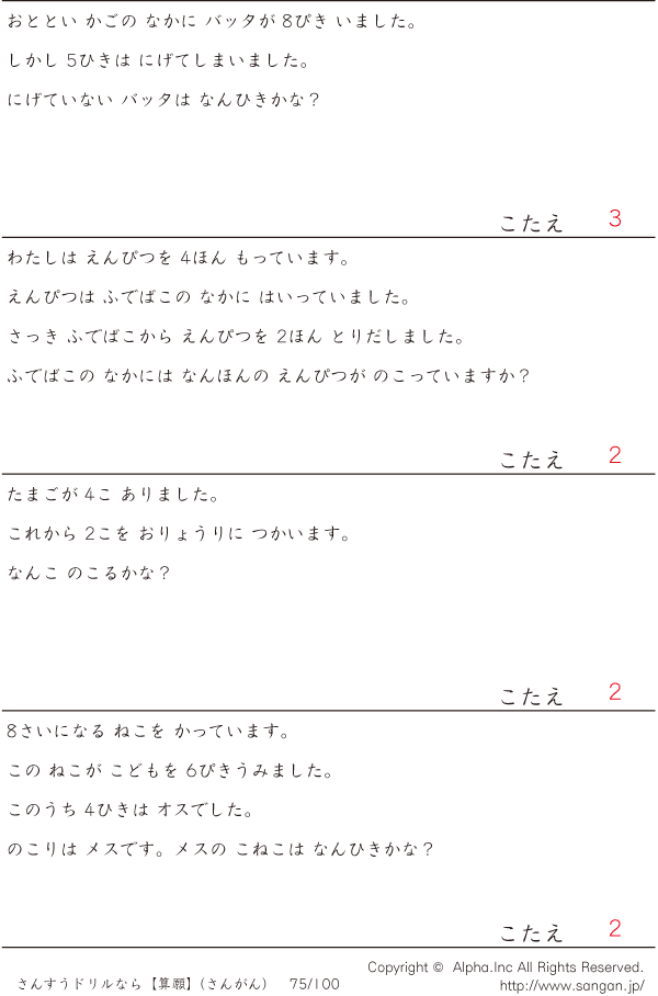 1桁の引き算の文章題(ひらがな) [解答]075/100