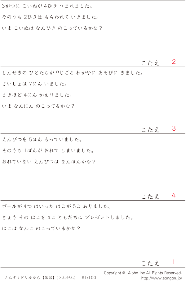 1桁の引き算の文章題(ひらがな) [解答]081/100