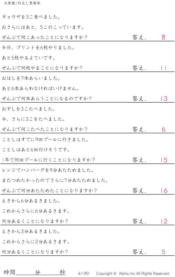 1桁の足し算の文章題 [解答]004/180
