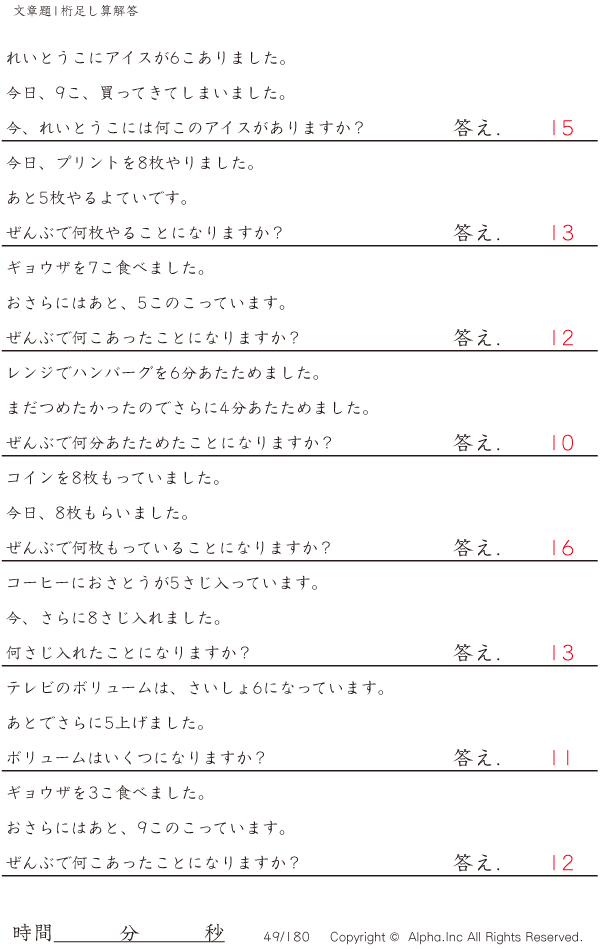 1桁の足し算の文章題 [解答]049/180