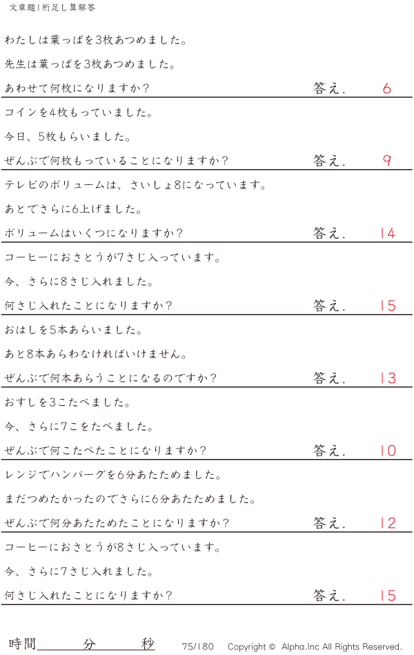 1桁の足し算の文章題 [解答]075/180