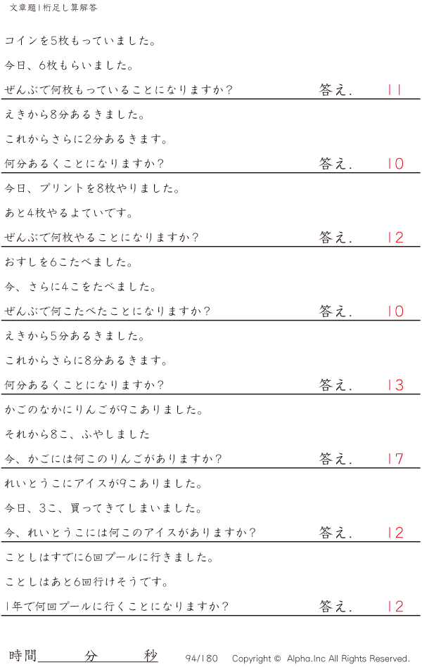 上記のボタンから「1桁の足し算の文章題」の算数数学ドリル・計算ドリル(PDFプリント)がダウンロードできます。個人利用は無料です(家庭以外での配布は有料です)。