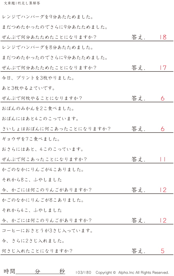 上記のボタンから「1桁の足し算の文章題」の算数数学ドリル・計算ドリル(PDFプリント)がダウンロードできます。個人利用は無料です(家庭以外での配布は有料です)。