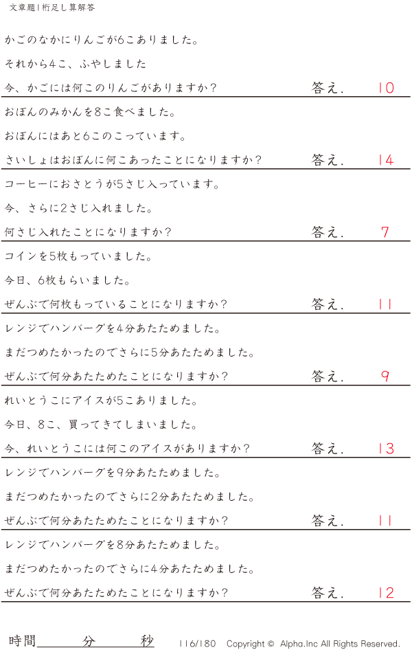 1桁の足し算の文章題 [解答]116/180