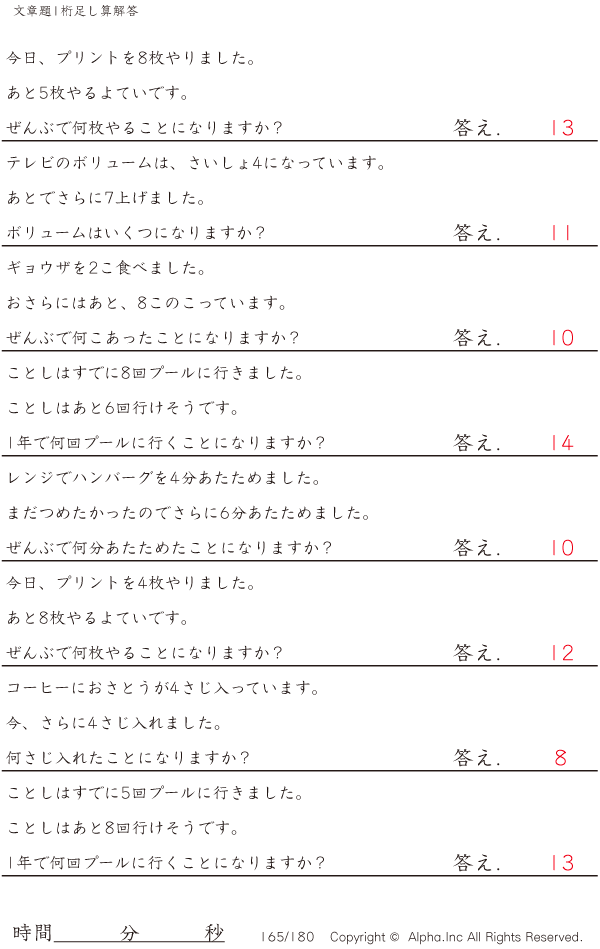 上記のボタンから「1桁の足し算の文章題」の算数数学ドリル・計算ドリル(PDFプリント)がダウンロードできます。個人利用は無料です(家庭以外での配布は有料です)。