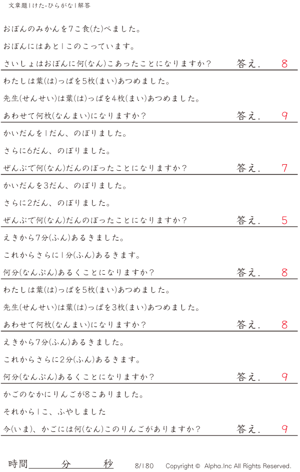 1桁の足し算の文章題ふりがな付き1 [解答]008/180