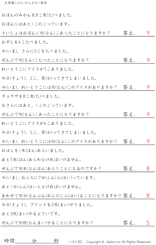 1桁の足し算の文章題ふりがな付き1 [解答]115/180