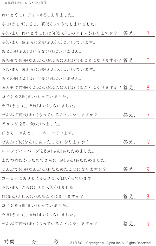 1桁の足し算の文章題ふりがな付き1 [解答]131/180