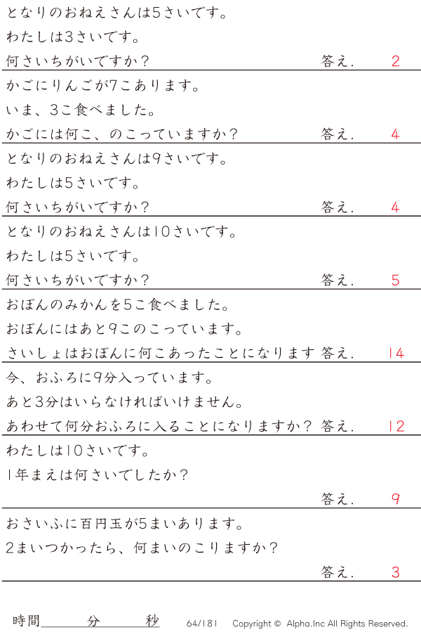 上記のボタンから「1桁の足し算と引き算」の算数数学ドリル・計算ドリル(PDFプリント)がダウンロードできます。個人利用は無料です(家庭以外での配布は有料です)。