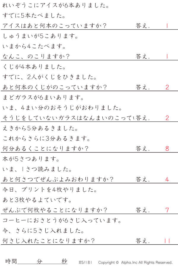 上記のボタンから「1桁の足し算と引き算」の算数数学ドリル・計算ドリル(PDFプリント)がダウンロードできます。個人利用は無料です(家庭以外での配布は有料です)。