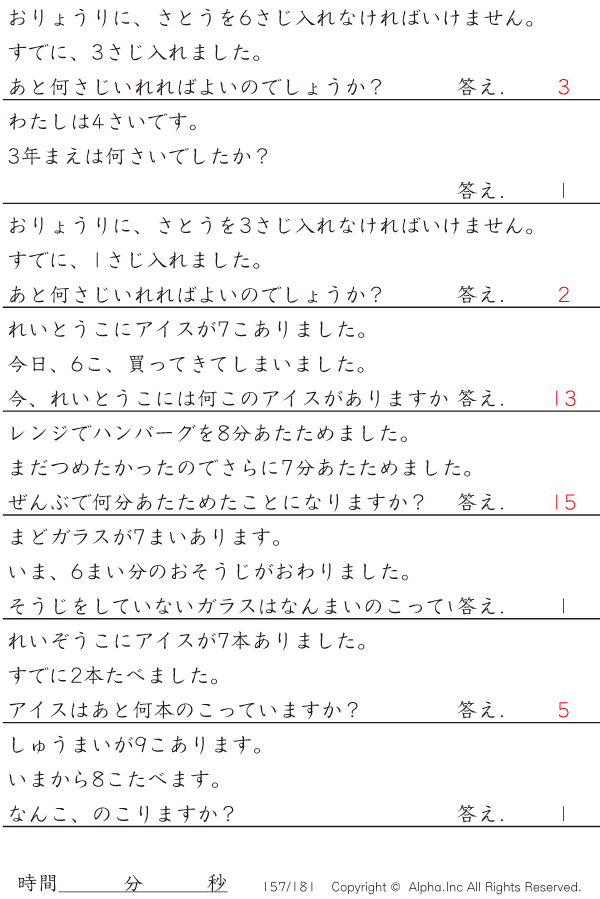 上記のボタンから「1桁の足し算と引き算」の算数数学ドリル・計算ドリル(PDFプリント)がダウンロードできます。個人利用は無料です(家庭以外での配布は有料です)。