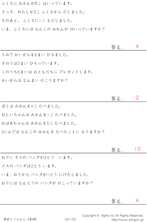 算数文章題 足したり 引いたり@4-[問題リスト] [解答]024/100