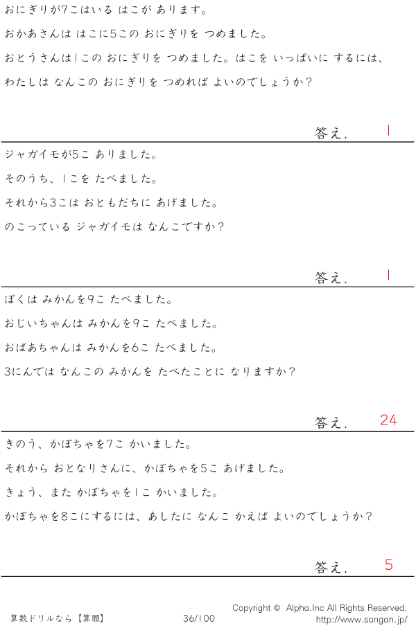 算数文章題 足したり 引いたり@4-[問題リスト] [解答]036/100