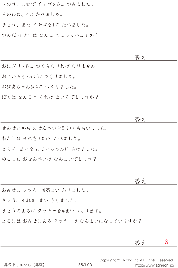 算数文章題 足したり 引いたり@4-[問題リスト] [解答]055/100