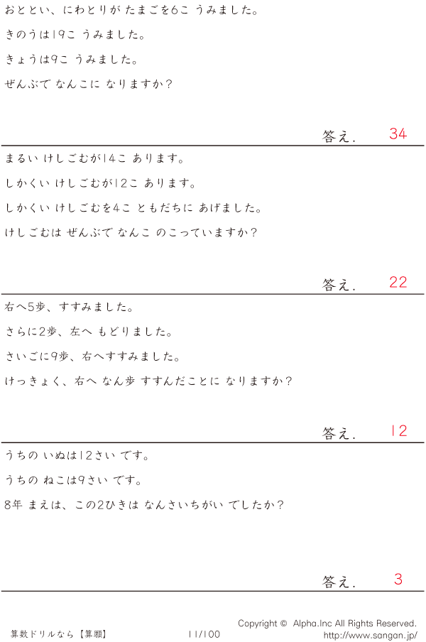 算数文章題 足したり 引いたり(中級 2年)@4-[問題リスト] [解答]011/100