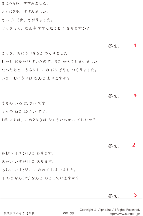 算数文章題 足したり 引いたり(中級 2年)@4-[問題リスト] [解答]099/100