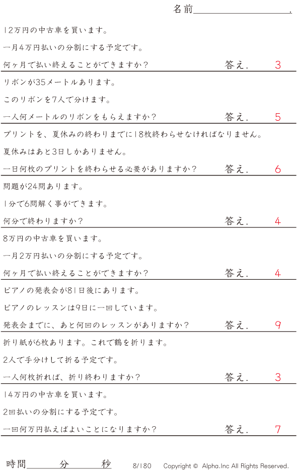 上記のボタンから「1桁の割り算の文章題」の算数数学ドリル・計算ドリル(PDFプリント)がダウンロードできます。個人利用は無料です(家庭以外での配布は有料です)。