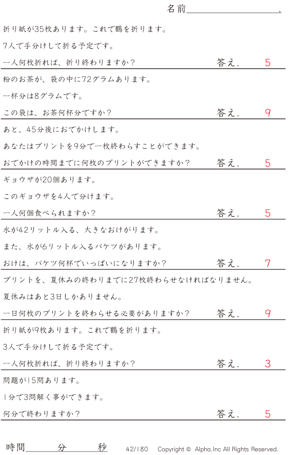上記のボタンから「1桁の割り算の文章題」の算数数学ドリル・計算ドリル(PDFプリント)がダウンロードできます。個人利用は無料です(家庭以外での配布は有料です)。