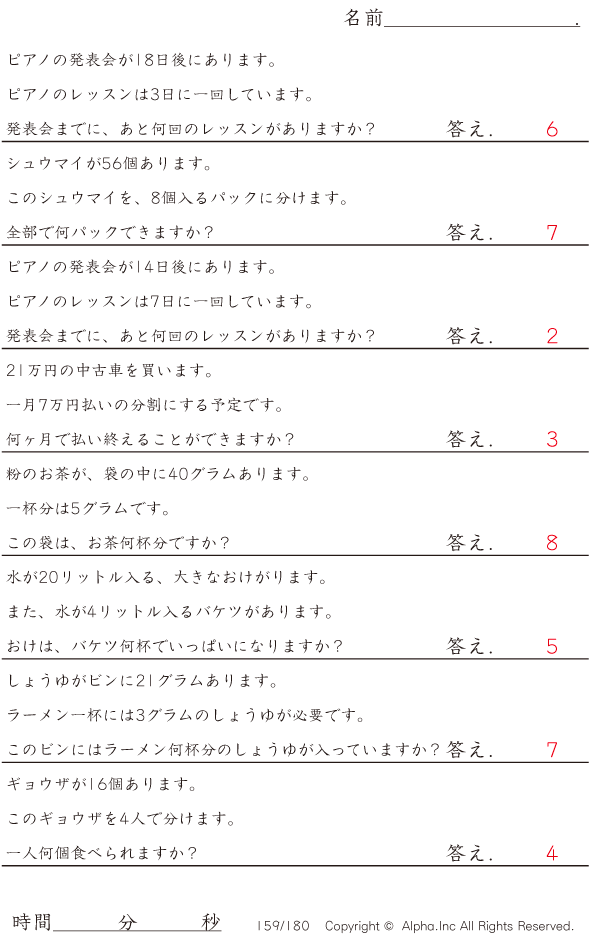 上記のボタンから「1桁の割り算の文章題」の算数数学ドリル・計算ドリル(PDFプリント)がダウンロードできます。個人利用は無料です(家庭以外での配布は有料です)。