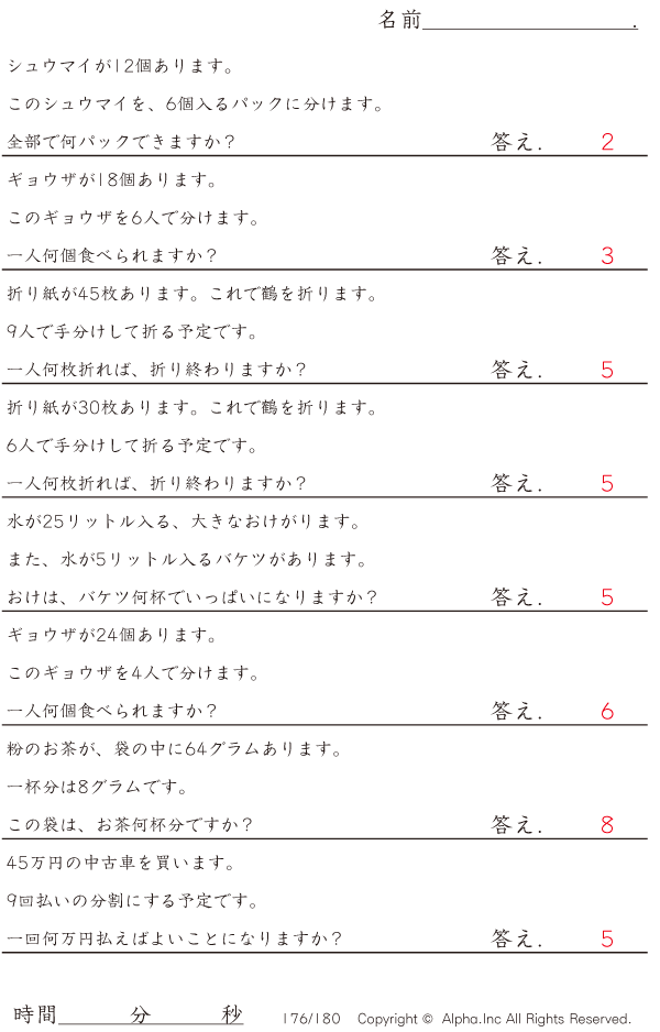 上記のボタンから「1桁の割り算の文章題」の算数数学ドリル・計算ドリル(PDFプリント)がダウンロードできます。個人利用は無料です(家庭以外での配布は有料です)。