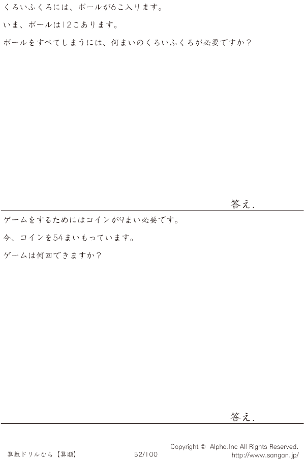上記のボタンから「文章題テープ図割り算(掛け算)」の算数数学ドリル・計算ドリル(PDFプリント)がダウンロードできます。個人利用は無料です(家庭以外での配布は有料です)。