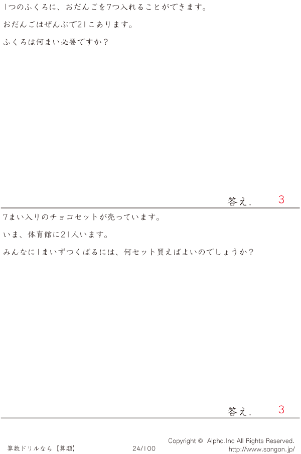 上記のボタンから「文章題テープ図割り算(掛け算)」の算数数学ドリル・計算ドリル(PDFプリント)がダウンロードできます。個人利用は無料です(家庭以外での配布は有料です)。