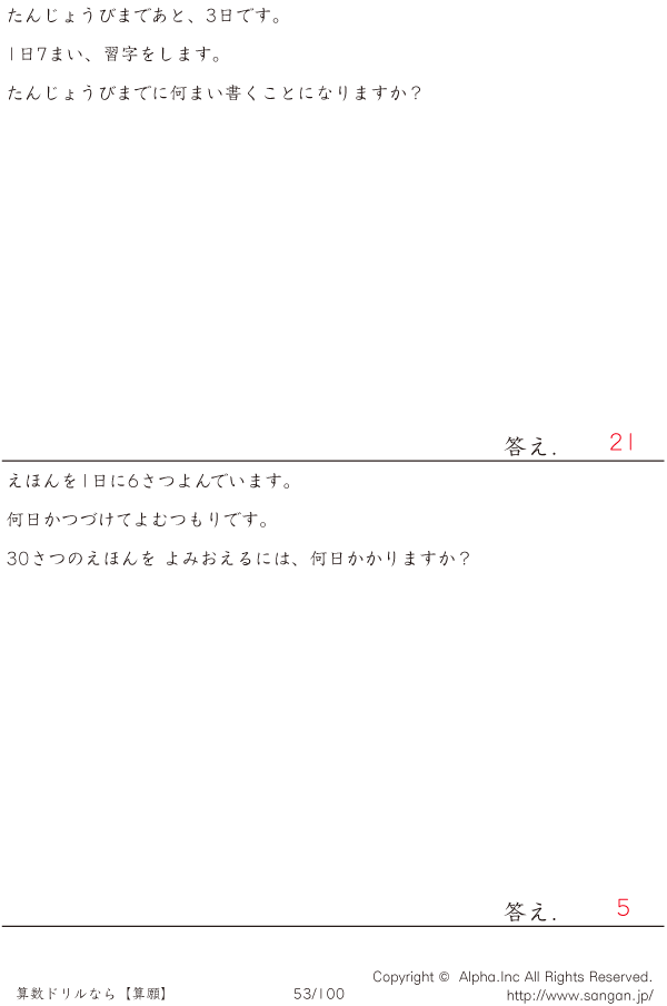 上記のボタンから「文章題テープ図割り算(掛け算)」の算数数学ドリル・計算ドリル(PDFプリント)がダウンロードできます。個人利用は無料です(家庭以外での配布は有料です)。