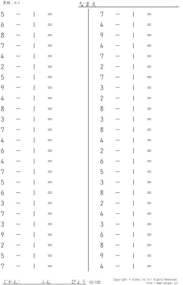 上記のボタンから「A-1」の算数数学ドリル・計算ドリル(PDFプリント)がダウンロードできます。個人利用は無料です(家庭以外での配布は有料です)。