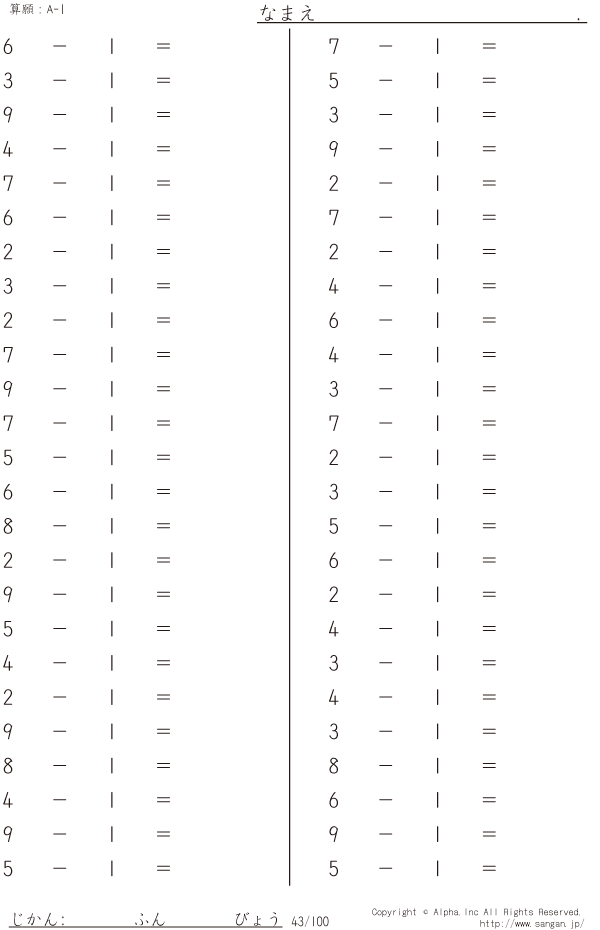 上記のボタンから「A-1」の算数数学ドリル・計算ドリル(PDFプリント)がダウンロードできます。個人利用は無料です(家庭以外での配布は有料です)。