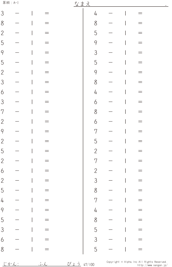 上記のボタンから「A-1」の算数数学ドリル・計算ドリル(PDFプリント)がダウンロードできます。個人利用は無料です(家庭以外での配布は有料です)。
