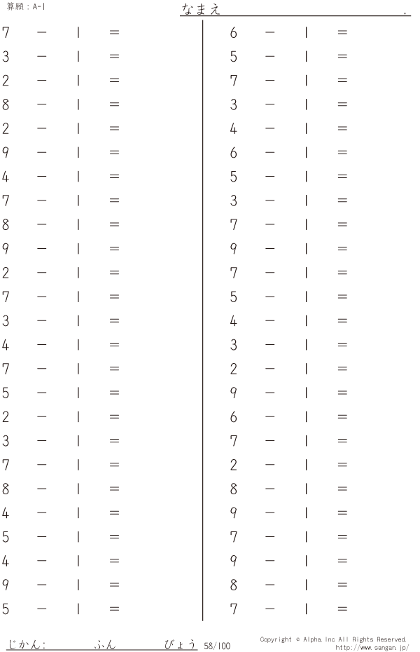 上記のボタンから「A-1」の算数数学ドリル・計算ドリル(PDFプリント)がダウンロードできます。個人利用は無料です(家庭以外での配布は有料です)。