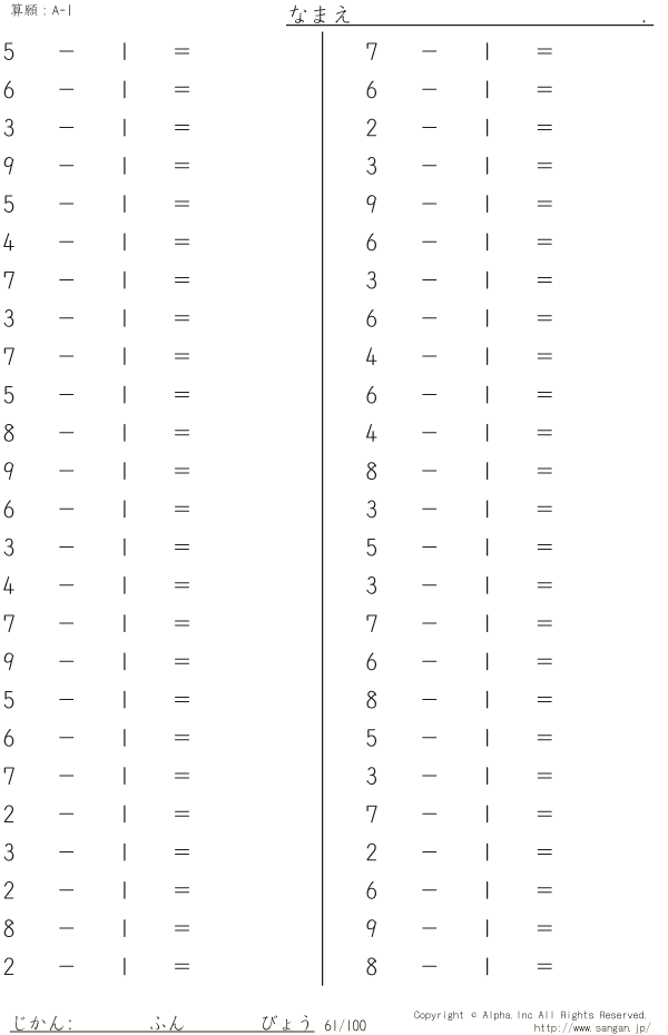 上記のボタンから「A-1」の算数数学ドリル・計算ドリル(PDFプリント)がダウンロードできます。個人利用は無料です(家庭以外での配布は有料です)。