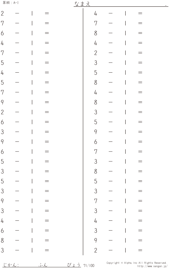 上記のボタンから「A-1」の算数数学ドリル・計算ドリル(PDFプリント)がダウンロードできます。個人利用は無料です(家庭以外での配布は有料です)。
