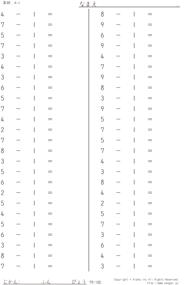 上記のボタンから「A-1」の算数数学ドリル・計算ドリル(PDFプリント)がダウンロードできます。個人利用は無料です(家庭以外での配布は有料です)。