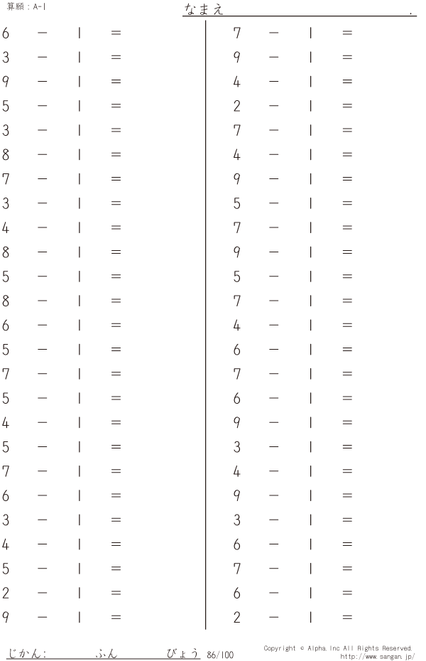 上記のボタンから「A-1」の算数数学ドリル・計算ドリル(PDFプリント)がダウンロードできます。個人利用は無料です(家庭以外での配布は有料です)。
