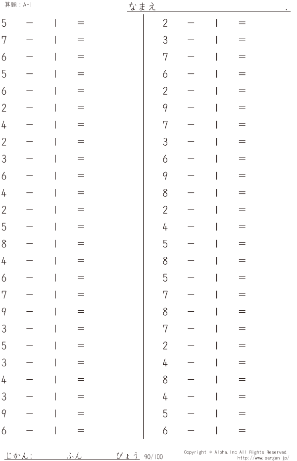 上記のボタンから「A-1」の算数数学ドリル・計算ドリル(PDFプリント)がダウンロードできます。個人利用は無料です(家庭以外での配布は有料です)。