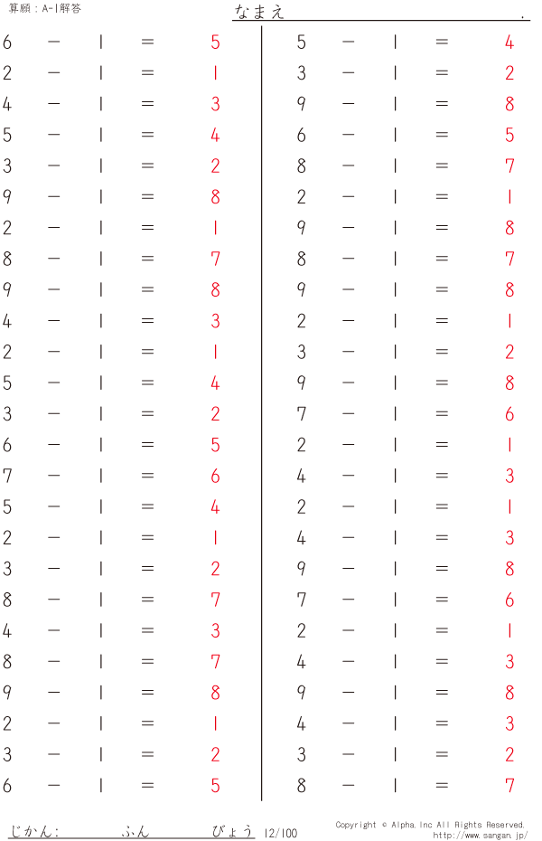 上記のボタンから「A-1」の算数数学ドリル・計算ドリル(PDFプリント)がダウンロードできます。個人利用は無料です(家庭以外での配布は有料です)。