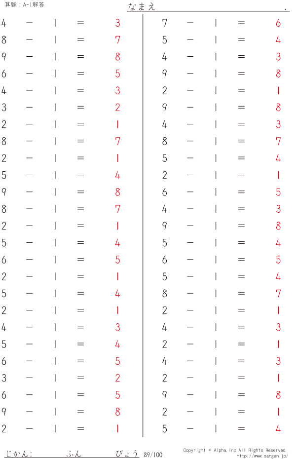 上記のボタンから「A-1」の算数数学ドリル・計算ドリル(PDFプリント)がダウンロードできます。個人利用は無料です(家庭以外での配布は有料です)。