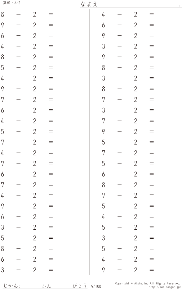 上記のボタンから「A-2」の算数数学ドリル・計算ドリル(PDFプリント)がダウンロードできます。個人利用は無料です(家庭以外での配布は有料です)。